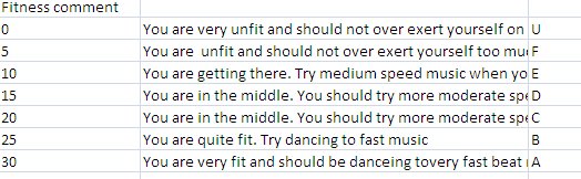 The image above shows a comment table for fitness. Have a look at the example spreadsheet for more details. The scores on the left range from the smallest score for fitness to the largest. You do not need to create a comment for every score but you DO need to start from the lowest and end in the highest score.