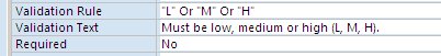 | Or | Or connector | Connects two valudation rules together (either could be true) |