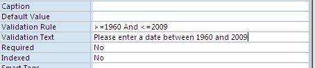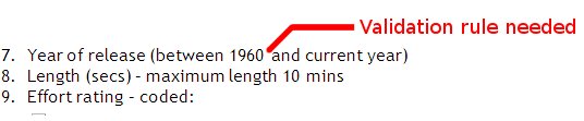 This needs a rule which only allows years to be entered between 1960 and 2009 (or what ever year it currently is!). The field below can not be any bigger than 10 mins (or 600 seconds).