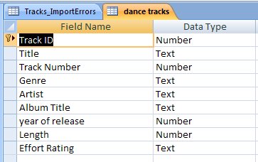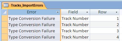 The contents of the import errors table will show you which rows have errors and what those errors are. In this case the field "Track Number" is causing problems. Type conversion error means that we may of selected the wrong data type when desiging the database.