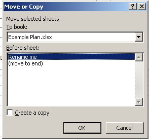 We then need to create a copy for every task you have written down. To do this right click again on the work sheet but this time choose "Move or Copy". You will get a small window looking like the one in the screen shot below. Make sure you click on "create a copy" and also on "move to end".